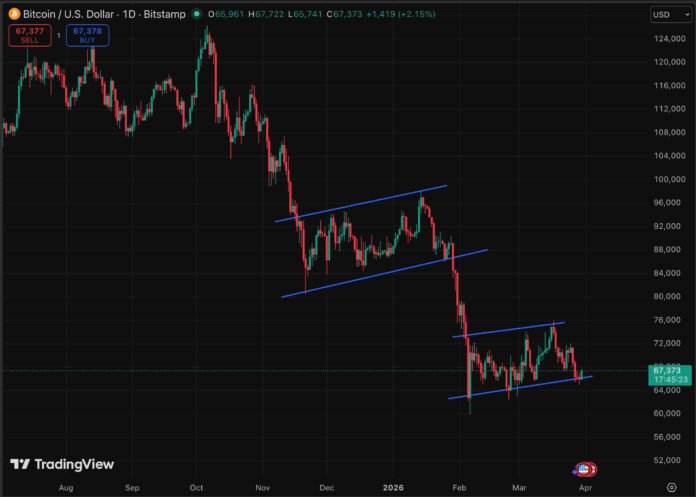 - Consolidation persists between $65,000 and $72,000 through early April as markets digest U.S. macro data; no breakdown, no breakout, just accumulation.