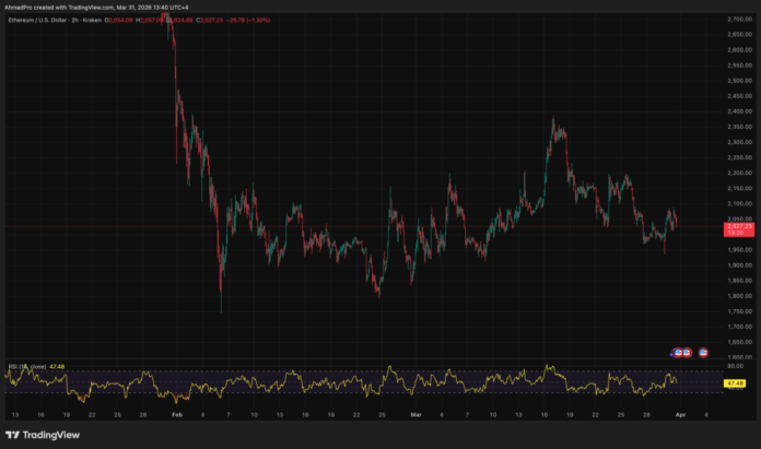 Key resistance sits at $2,200 – a level ETH has failed to reclaim since the October crash – while near-term support holds around $1,980, a zone that has absorbed two recent liquidation events. RSI on the daily chart is hovering near 42, not yet oversold but showing no clear momentum reversal signal.