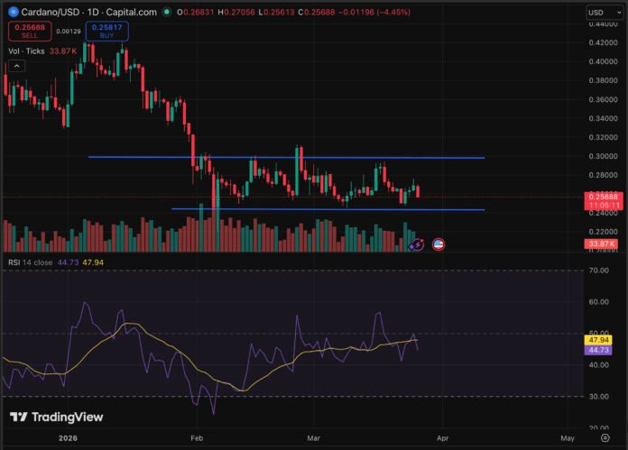 ADA is consolidating in a tight band between $0.24 and $0.3, with neutral daily RSI at 47, neither oversold enough to trigger aggressive dip-buying nor strong enough to signal momentum.