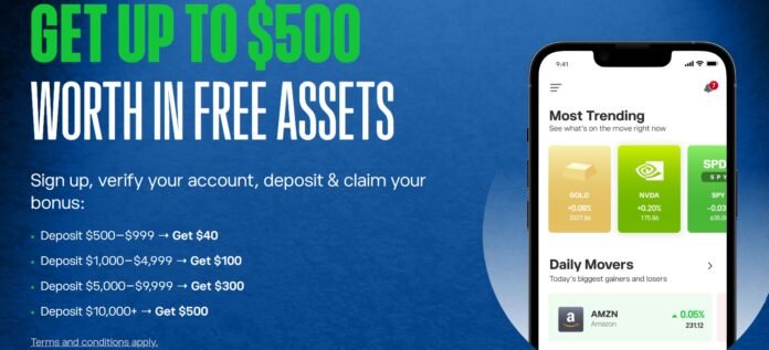 eToro is offering new users up to $500 in free assets when they open and fund an account. Sign up, verify your identity, deposit funds, and claim, with a scale based on how much you put in: $40 for deposits between $500 and $999, rising to a full $500 for deposits of $10,000 or more.
