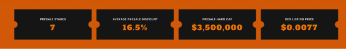 The DEX listing price is set at $0.0077, offering presale buyers an average discount of 16.5% – a compelling incentive for those looking to enter early.