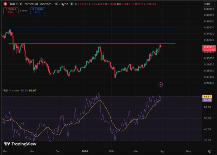 TRX is consolidating in a tight corridor. Traders peg a 5-day target of $0.33, an 8-9% move from current levels, while Binance forecasts $0.32 by March 30. Not exactly explosive numbers, but the technical setup is coiling.