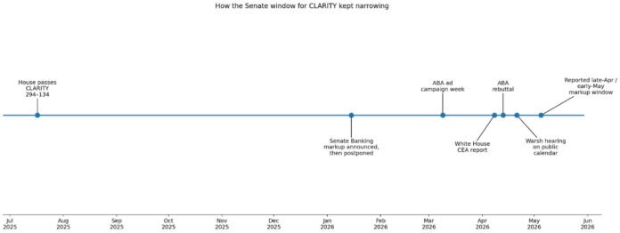 The CLARITY Act’s Senate path has narrowed across nine months, from a bipartisan House passage to a still-unscheduled markup amid escalating bank lobbying.