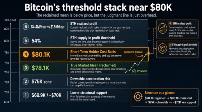 On-chain data frames Bitcoin’s (BTC) approach to $80,000 as a behavioral tripwire, a ceiling built from the breakeven psychology of recent buyers.