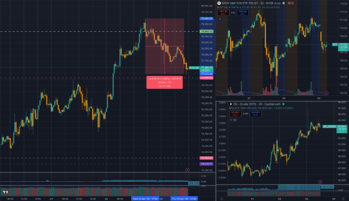 The latest price action suggests the first pressure point is the risk channel, with the oil and rates channel operating in the background. The question now is whether BTC can turn the mid-$77,000s into a base before the Apr. 24 options expiry and the next macro calendar cluster.