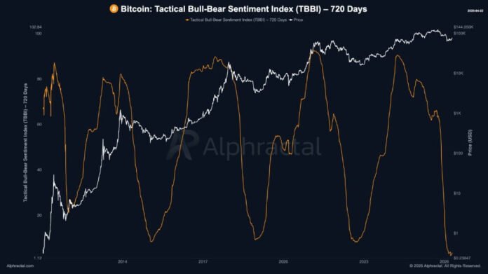According to data from Alphractal, Bitcoin funding rates have plunged to their most negative levels since 2023, with the seven-day moving average hitting -0.005%. The prevailing sentiment among retail participants is dominated by short bias, fear, and disbelief.