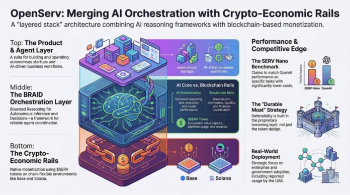 OpenServ deserves attention, but the correct frame remains disciplined. The company appears to be building an AI infrastructure platform with blockchain rails on Base and Solana, while using benchmark results against OpenAI-linked models to argue that its reasoning layer can deliver better economics on bounded tasks.
